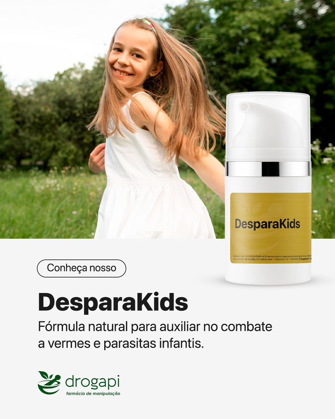 O DesparaKids é um creme formulado com extratos naturais que auxiliam no equilíbrio intestinal e fortalecimento da imunidade das crianças. É utilizado como coadjuvante nos cuidados com verminoses, promovendo bem-estar e conforto.